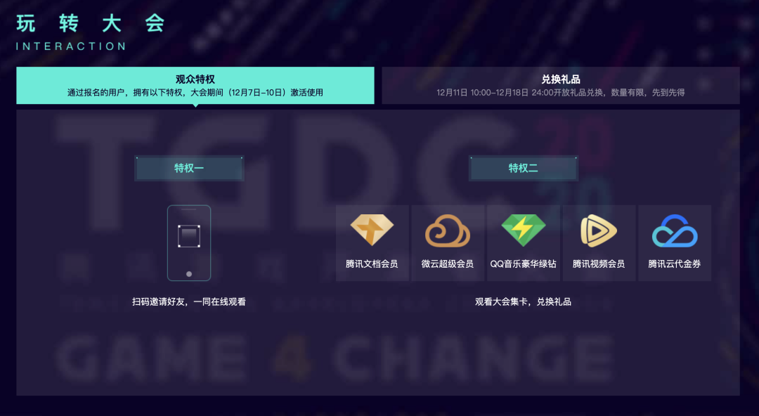 报名通过的用户,在大会直播期间将获得双重特权,不仅可以在观看直播期间获得专属邀请页面,通过扫码可以邀请好友一同在线观看,还可以在观看大会的过程中收集页面每天掉落的卡片,集齐不同数量和品类的卡片可兑换腾讯文档会员、微云超级会员、QQ音乐豪华绿钻、腾讯视频会员和腾讯云代金券等礼品。