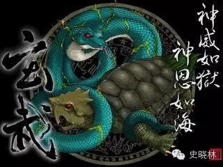 是一种由龟和蛇组合成的一种灵物。玄武的本意就是玄冥,武、冥古音是相通的。武,是黑色的意思;冥,就是阴的意思。玄冥起初是对龟卜的形容:龟背是黑色的,龟卜就是请龟到冥间去诣问袓先,将答案带回来,以卜兆的形式显给世人。因此,最早的玄武就是乌龟。以后,玄冥的含义不断地扩大。龟生活在江河湖海(包括海龟),因而玄冥成了水神;乌龟长寿,玄冥成了长生不老的象征;最初的冥间在北方,殷商的甲骨占卜即「其卜必北向」,所以玄冥又成了北方神。