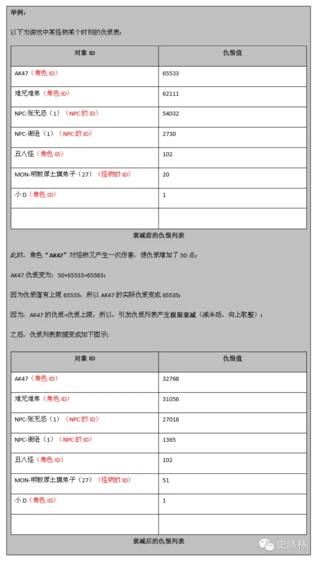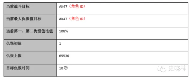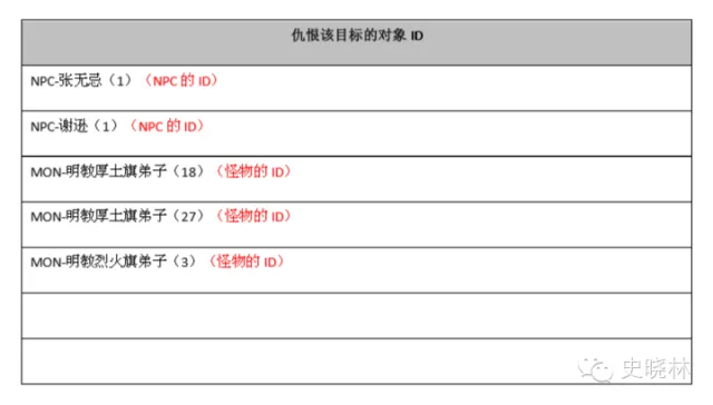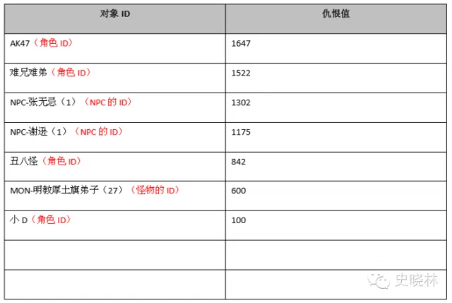 1、仇恨值表:只存在于怪物和NPC身上,用于记录已经产生仇恨的玩家角色、怪物和NPC的ID以及对应的仇恨值。如下表: