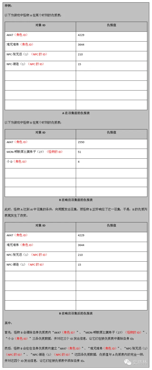 当某个怪物B响应怪物A的召集时,会复制怪物A仇恨表中所有目标的ID以及ID的仇恨值,然后取代自身仇恨列表——此时,需先向B原有仇恨表内的所有ID发出信息,将自身ID从目标ID的被仇恨表中清除,然后再给B新仇恨表内的所有ID发出信息,将自身ID添加到目标ID的被仇恨表中清楚。(注意:执行第一步时,不能视为完全清除B的仇恨表,避免B因为仇恨表清空而发生数据重置的过程)。