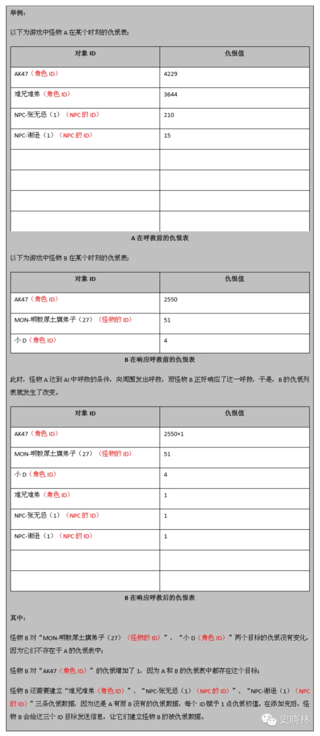 当某个怪物B响应怪物A的呼救时,会复制怪物A仇恨表中所有目标的ID,给每一个ID赋予100点仇恨以后,添加到自身的仇恨表内——如果是自身表内已有ID,则执行“仇恨变化”操作;如果是自身内没有的ID,则执行“仇恨建立”操作,操作完,向该目标ID发出信息,将自身ID添加到目标ID的被仇恨表中。