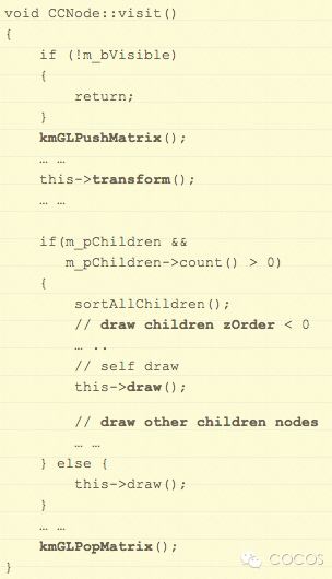 Cocos2d-x采用“渲染树”的方式进行绘制,即先从场景(Scene)的顶层根节点开始,深度优先的递归绘制Child Node。而整个绘制的顶层节点是CCScene。绘制从m_pRunningScene->visit()真正开始。visit是Scene、 Layer、Sprite的共同父类CCNode实现的方法:
