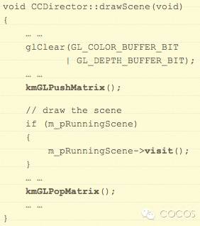 由《Hello,Cocos2d-x》一文我们知道,一旦引擎初始化完毕,就开始了每帧图像的绘制工作,Render Thread在一个“死循环”中反复调用CCDirector的drawScene方法 (CCDisplayLinkDirector::mainLoop中调用了drawScene):
