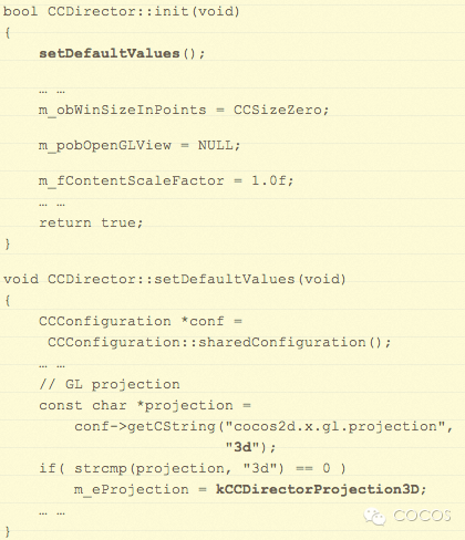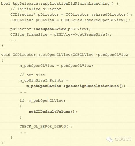 这里是引擎部分初始化的起点:CCDirector和CCEGLView先后完成创建与初始化。接下来我们分别看一下这两个过程,我们主要关 注与绘制参数设置相关的内容: