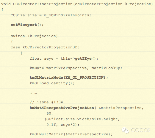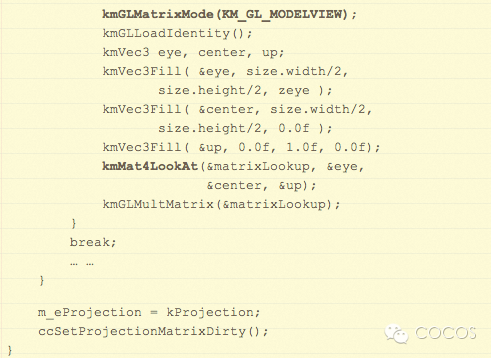 再回顾一下CCDirector::setProjection,该函数通过kazmath先后设置了 projection_matrix_stack和modelview_matrix_stack的top元素。