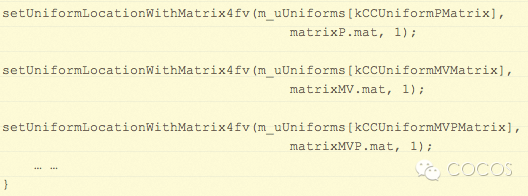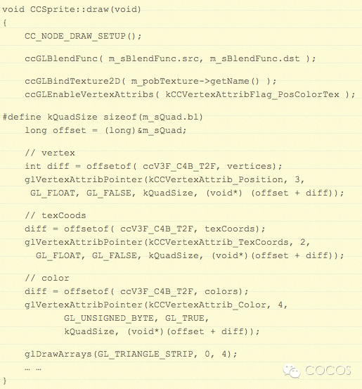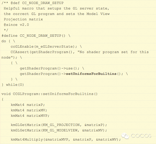 这里的draw是一个典型的OpenGL绘制工序。CC_NODE_DRAW_SETUP()将之前的经过若干准备而得到的最终各类变换矩阵 整合并传给OpenGL: