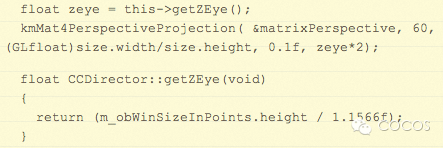 我们计算出来的结果是 h = m_obWinSizeInPoints.height = 设计分辨率中的高度分量。这意味这什么呢?Cocos2d-x是2D游戏渲染引擎,针对该引擎的模型的z坐标都是0,因此模型实际上就在xy平面内,也就 是说eye与原点的距离恰好就是eye与模型的距离,而模型可显示区域的最大高度也就是h,即m_obWinSizeInPoints.height。这 个结论会在后续问题分析时发挥作用。
