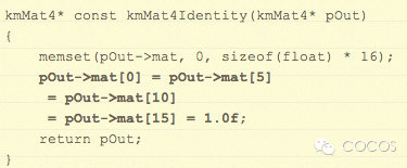 kmMat4Identify用于初始化“单位矩阵(Indentify Matrix)”,所谓"单位矩阵",指的是对脚线上元素都为1的矩阵。从kmMat4Identify的实现,我们也可以看出这一点: