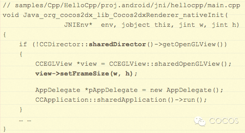 nativeInit中的view->SetFrameSize(w, h)用于设置的屏幕物理分辨率,如果你的手机是960×640分辨率的,那FrameSize就是960×640。