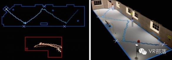 左边,蓝色显示虚拟空间,红色显示实际空间。右边:虚拟房间里的路径。Razzaque et al / EUROGRAPPHICS 2001