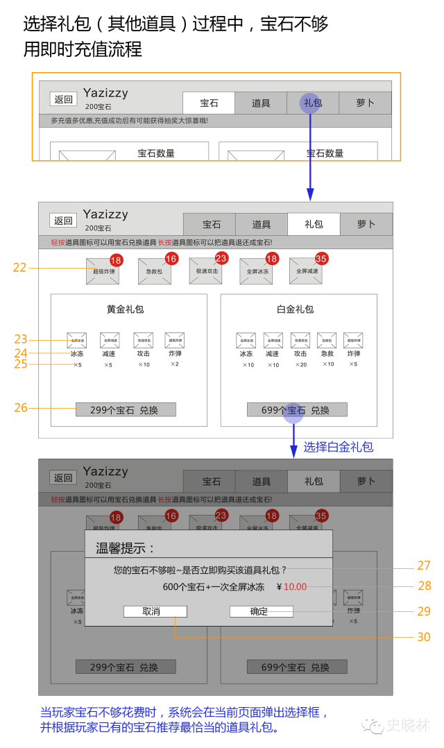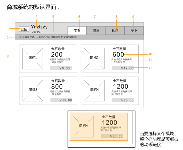 批注:这里可以根据系统大小来调整,如果是大系统,这里可以写系统概述,系统概述就是玩家在这个界面都能做什么。然后最好有个整体的系统架构图(脑图)。也方便我们在规则说明中对系统规则进行详细的补充说明。作者这里针对玩家宝石数量不够,做出的人性化设计(好有情怀)是提示玩家购买可能宝石数量足够的低等次礼包。这个我不是是非推崇(我们一般的做法是,钱不够了,立马提示玩家去充值)毕竟玩家已经做出了有针对性的选择,我们能做的就是帮助他快速达到自己所选择的这个条件。勇敢的少年啊,快去游戏充值~(不知道为什么嘴里唱出了这句。。。)