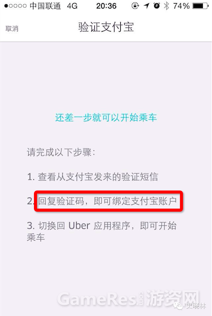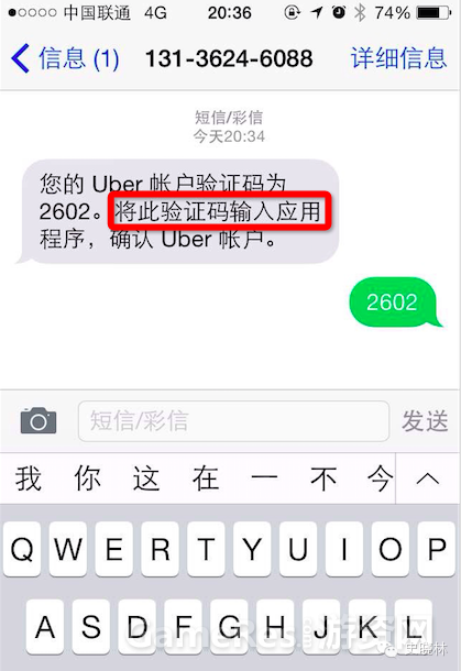 再举例最近火的不得了的 uber,这是我当时,用 uber 绑定支付宝时 ,其app 界面和短信界面: