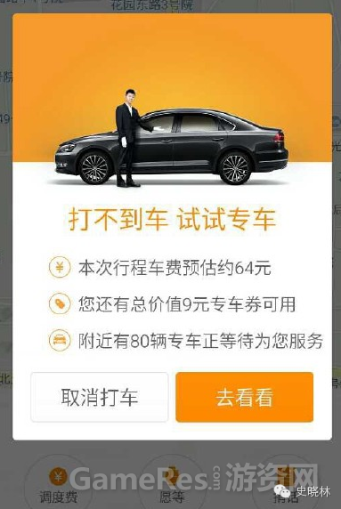 而下图是在滴滴打车 app 中,取消叫车时,也会弹出专车的广告。