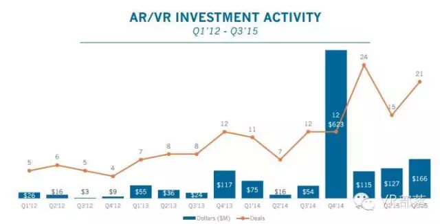 After Magic Leap’s $542M financing drove Q4’14 funding to $623M across 12 deals, AR/VR investment activity reached a record high in Q1’15 with 24 deals raising $115M. Funding has since increased for two straight quarters, to $166M on 21 deals in Q3’15. While the bulk of the deals remain at the early-stage, there were over 10 $10M+ financings in the first three quarters of 2015.