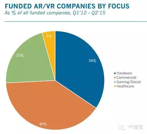 AR/VR startups with a focus on commercial use-cases accounted for 40% of all funded startups since 2012. These include Blippar, which enables augmented reality for brands and publishers, as well as Augment, which utilizes AR for sales and e-commerce. Hardware, which includes multiple companies developing hardware platforms for AR/VR applications, saw the second highest company share at 34%. Gaming/Social was third, while a few startups such as Deepstream VR and LensAR are focused on healthcare applications within the AR/VR realm.