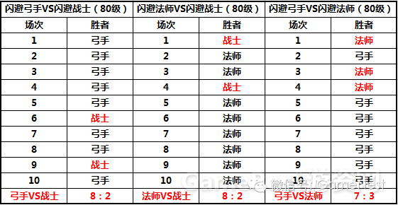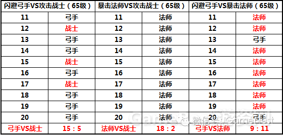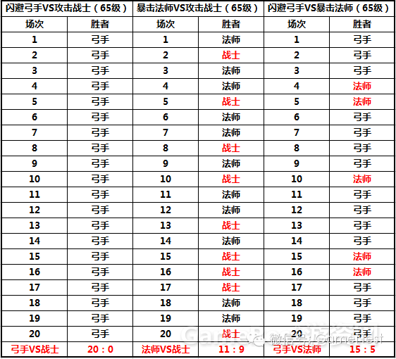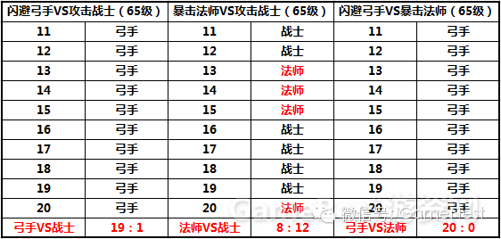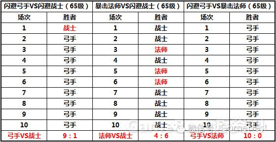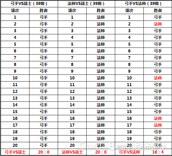 此时的战士几乎完全不是弓手和法师的对手,尤其在面对弓手时无一胜绩。而弓手则保持着对其他职业的绝对优势。