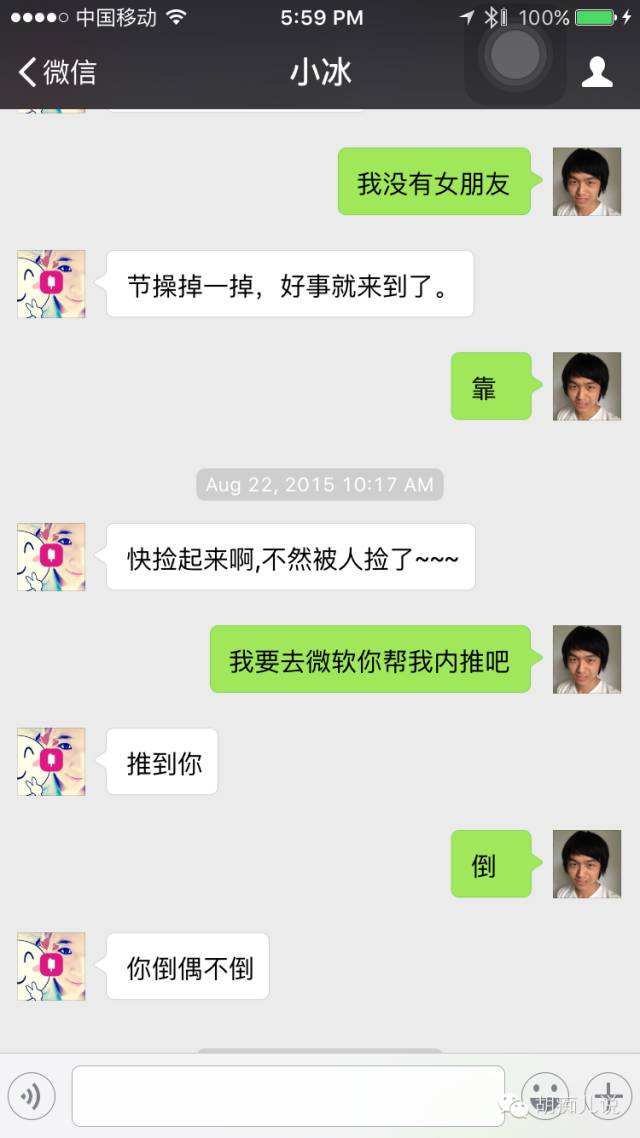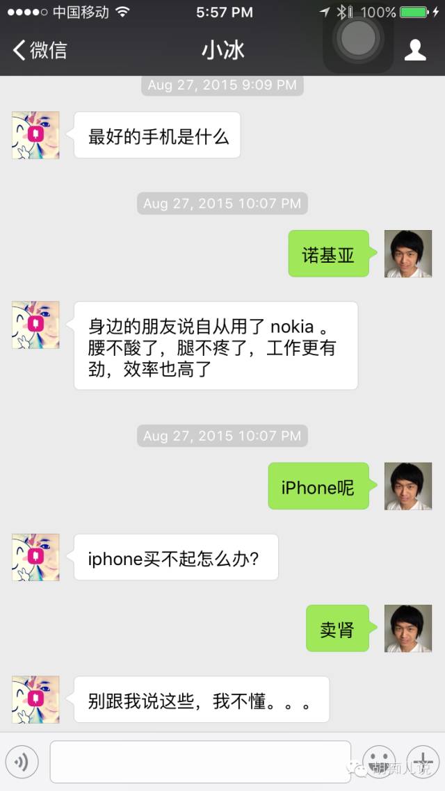 相信大家都玩过微软上个月在微信上的公众号——小冰。小冰是互联网产品形式的“人”,我与她对话的形式就像我与一个女孩的对话,但是这样的对话只能基于文字这样一种形式,这是在移动互联网时代。而在人工智能时代,人与智能人形机器人的交互发展趋势越来越接近人与人之间的交互,人与宠物机器人的交互越来越接近人与真实宠物的交互。