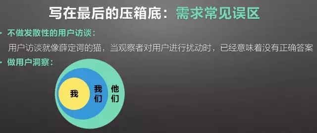 还有一个需求常见误区是不要做发散性用户访谈,用户访谈像薛定谔的猫,当观察者对用户进行扰动时,已经意味着没有正确答案。大家回头看一下薛定谔的猫的详细理论,在这里不赘述。用户层面也要做洞察,我是一个圈,我们之外还有一个圈,由于人性天然的排他性,我们会在潜意识中忽略掉非自己的同类——他们。对于广大用户来说,都是被你划在我们这个圈之外。