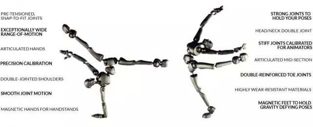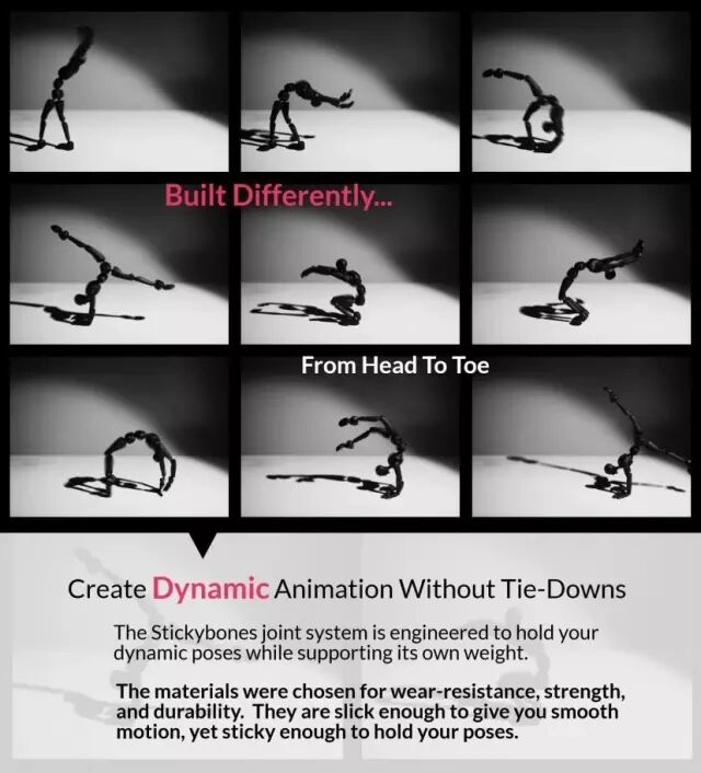 stickybones是一个新的神器,他是可以摆POSE的人物模型,它以高精度的构造和骨骼系统正在申请专利。stickybones适合用于动画,而且它采用了耐用的聚合物材质,在方便随意活动关节的同时,又有足够的摩擦力去保持人物的姿势。。它由工业强度超强的材料构成,他是由联锁部件的预紧单元配合(球和插座的原理扣合在一起),采用了和人类一致的关节设计,设计师可以从头到脚的操作每一个模型关节,摆出自己脑海中想要的人物姿势,甚至更夸张。
