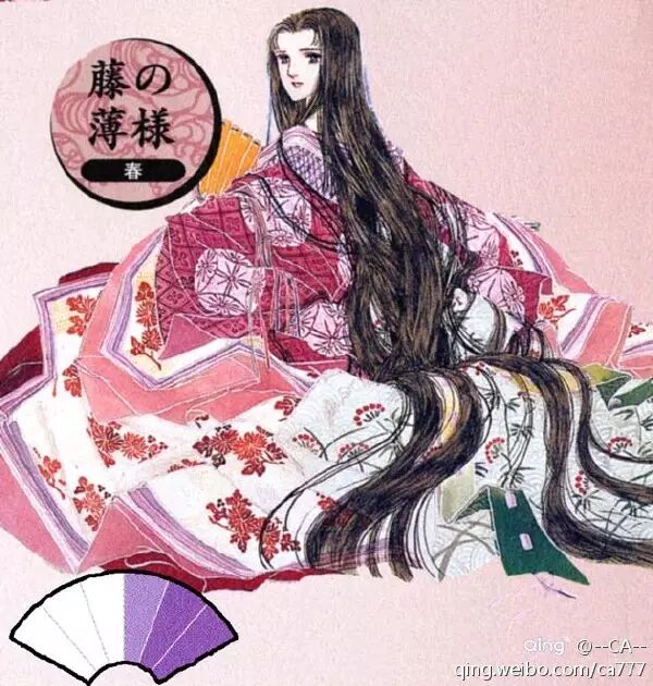 高贵的紫是藤壶皇后的代表色。这种配色适宜晚春至初夏着用。五つ衣从上至下分别为淡紫——淡紫——更淡的紫——白——白,单是白色或红色的。