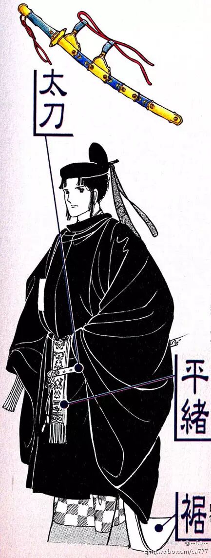 平绪:穿“束带”佩太刀时结这种带。身分高的贵族平绪上嵌着精美的提花刺绣,是自唐渡来的丝织品,颜色有绀、紫等