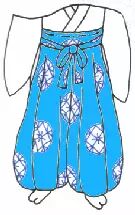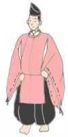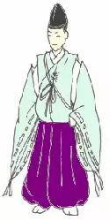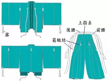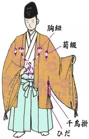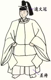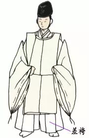 指貫:也叫做“奴袴”。裾呈袋狀,上面有帶子,在腳脖子處系牢固定。現代的袴裾上的帶子,是在帶子裏縫製帶扣,將裾帶穿入打結,並且可以調節帶子的長度。指貫的顏色因年齡不同而有區別,年輕人的顏色濃豔,元服前是濃紫色;隨著年齡的增長,顏色漸漸變淺。四十歲是淡藍色的縹色,自五十歲開始則著淺黃,到七十歲變成白色。式樣有龜甲、臥蝶、鳥擧、八藤等,自出生到元服前,指貫的材料為浮織物(即以提花織法制成的布料),元服以後,則改為一般的織物。