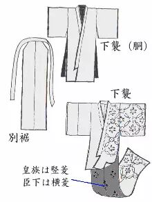 在單外、下襲內裏,要穿著紅色小葵紋綾(裏側為平絹)製成的衵。此外,「下襲」後面原本有很長的「裾」,但是由於穿著時極其複雜,所以漸漸演變為只有皇室使用;而其他官員所著的下襲則與「裾」分離,將「裾」的部分加上繩帶,另外系在腰間,這稱為「別裾」。由於「裾」象徵著權力和威嚴,因此隨著時代的變化多次加長。現在,通過對官員著「裾」長度的分辨,我們便可判斷出其所處的歷史時代。