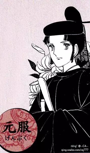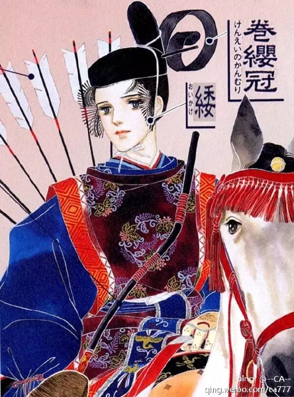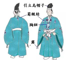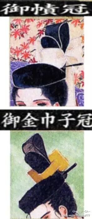 乌帽子:成人的男性贵族所戴之物,没有身份及文武的区别。11世纪前后分化为“立乌帽子”及“风折乌帽子”两种