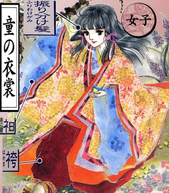 直衣:儿童用的尺寸缩小了的直衣,没有颜色的限制,多用鲜艳浓重的色彩。
