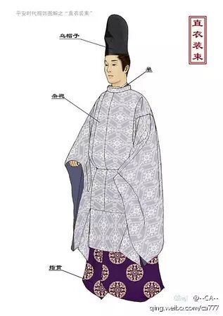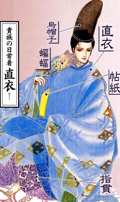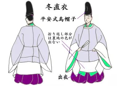 贵族的日常衣着——直衣 直衣是天皇及公卿们的日常衣着,除了禁色及象征位阶的颜色之外可自由选择颜色。平常是戴着乌帽子,手持折扇,在比较郑重的场合则是戴冠,直衣还要配“下覆”。直衣本是在私邸时穿的,但像源氏那样的位高权重者以直衣的形象参内也是被允许的。