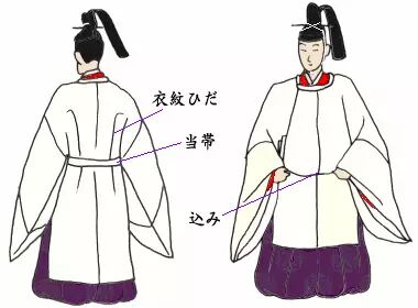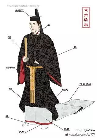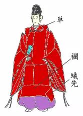 文官的正装——束带 束带是男性贵族参内(在内里出勤)时的职业装。根据位阶不同,束带的颜色、纹样、质地也不同。一位至四位是黑色,五位是绯色,六位是蓝色。根据衣装的颜色,地位的高低一目了然。
