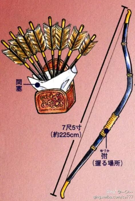 弓:日本的弓,从中间靠下的部分来握住,这是它的特征。为了提高强度及美化外形,涂上了漆之类等。