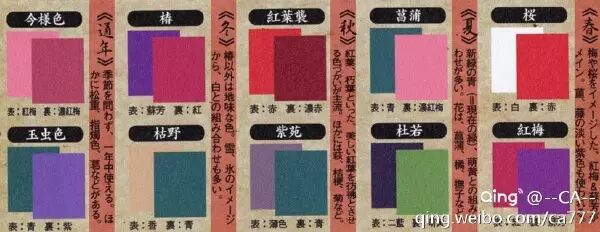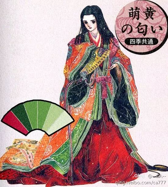 有关于袭(整套衣装)的配色 将四季的缤纷色彩体现在五つ衣上,这是平安时期流行的黄金定律。贵族女子们把草花的颜色移至自身的重重衣装,尽可能地表现出季节感。先不管适不适合自己,搭配着季节选颜色才是重点。“にぉぃ”是指同一色系从下至上越来越浓重的配色方法;而“薄样”的配色法,最下面的两件是穿白色的。