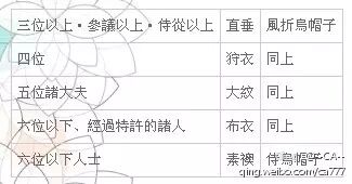 冠帽方面,五品以上的官員配戴烏帽子,六位以下則用風折烏帽子。