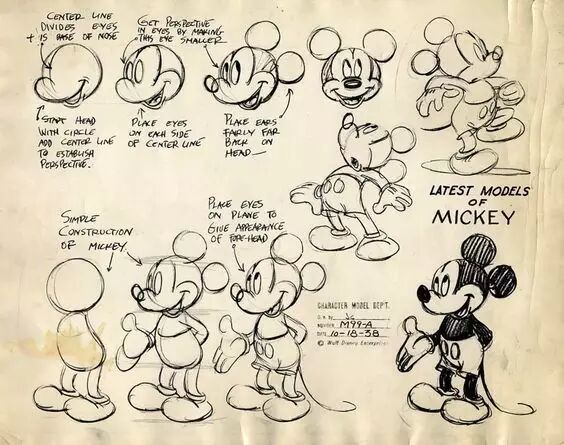 不过我们都知道,二维动画与三维和定格动画有着本质的区别:二维是一张张画出来的。因此,二维动画做不到绝对的精准,也因此创造出一些三维和定格动画无法达到的效果,例如角色的正面和侧面未必要符合一致。这里有一个经典的例子:在米老鼠的正面和侧面设计图中,耳朵是无法完全对上的。正面米老鼠的两只耳朵完全对称,如果按照透视关系,转到正侧面,两只耳朵会完全重合。但观众在米奇的侧面还会看到两只耳朵——而且是两只高度完全不同的耳朵。如果我们用三维软件制作出符合米老鼠正面耳朵的模型,转到侧面,模型就无法和侧面的耳朵相吻合。