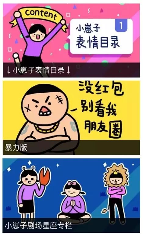 虽然流程有些复杂,但与漫画相比,“表情”毕竟是更具实用价值、更具传播能力的表现形式,并且,在当时大多数表情都走“乖萌”路线的情况下,搞笑贱萌的“小山”和“思子”很快脱颖而出,收获了大量粉丝,作者的创作热情也明显高涨,逐渐积累形成了“小崽子剧场”、“小崽子剧场星座专栏”、“小崽子剧场暴力版”、“小崽子剧场职场版”和“小崽子剧场君臣版”5个主要系列总共800~900个表情。
