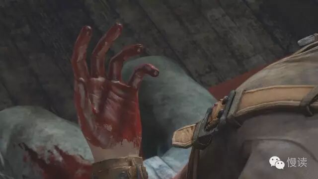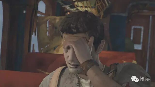 告知玩家主角受伤了,坐在椅子上,迅速切换到这个镜头。玩家会好奇德雷克当前的受伤状况,这个人怎么了?并抛出疑问,此时策划想要切镜头给具体了,但是如果切过去又太粗暴。这个时候需要一个技巧,主角表情狰狞,抬起手,眼睛看着手,这个时候再切。