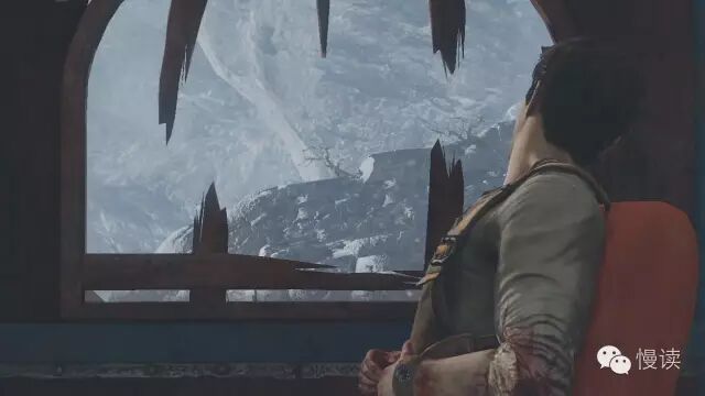 这组镜头,通过德雷克自身难受,并受到窗外的影响,开始向窗外看,将镜头自然合理的引向室外,告诉玩家教学关的大场景在雪域中。并且需要新的事件,继续吸引玩家注意力。
