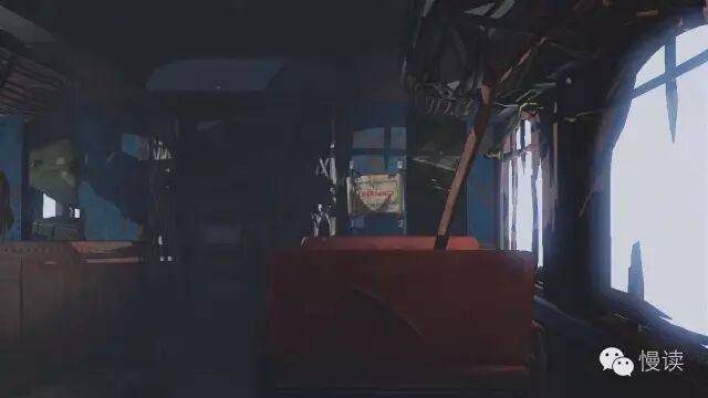 由于此时飘动的旗帜,和破碎的玻璃,以及窗外白茫茫的一片,镜头始终不稳定而又匀速的移动,让玩家很容易对后续内容产生好奇,似乎在这个空间发生过很激烈的事情。到此,初始场景已经给玩家介绍完了,只用了一个镜头,没有切镜头。