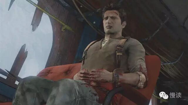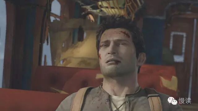 切到这个镜头,用特写来表现德雷克受伤严重。玩家了解到这里,这段就告一段落了。这个时候,玩家看局部是作为一个探究问题的心态来一路走下来。了解了主角和场景大概状况后,玩家可以接受下一组信息了。