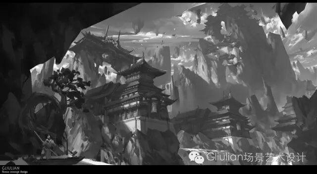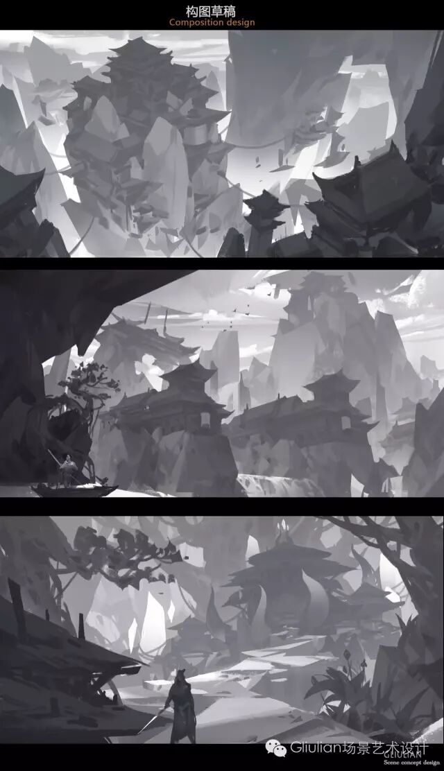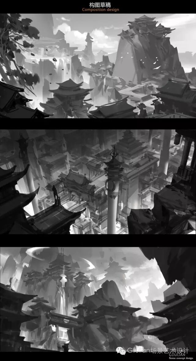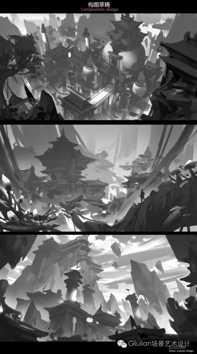 这里插播一个黑白稿吧~黑白稿是建立在构图之上的,画面内容和设计继续完善的一个过程,需要多对明暗层次上理解,任何好看的颜色都是搭建在一定素描关系上的,所以黑白的练习还是挺重要的,不管是直接颜色还是叠色的方式,都需要黑白的关系去支撑的。所以对于场景明暗空间的练习也是很有必要的。