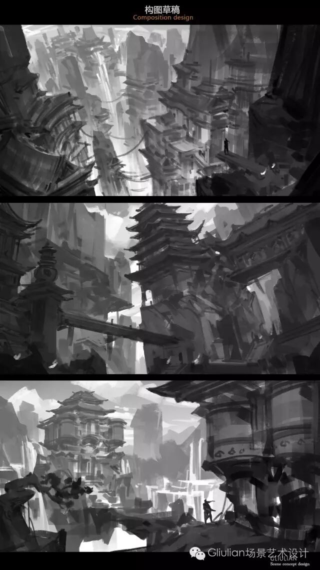 构图建议以草稿的方式去表达,构图稿不需要画很细致,不要掉进细节里面,这个时候画布也不要大,要不容易画进入,构图草稿每张控制在10分钟~30分钟之间,多去表达想法,构图更多从画面的构成,景别层次,内容安排,明暗空间等的角度去考虑,构图是画面最重要的步骤(真的太重要),也是一幅画的基础,不夸张的说,构图安排好了,你的画面基本就成功了一半,但往往画画的过程中,容易把重点放在深入细化上,这就是“舍本求末”,经常看到的一个现象是,画面的构图还没有设计好,或者是构图感是没有的,然后就开始纠结细节了,问为什么深入不进去,其实重点不在这里,没有构图的保障,深入再多都是徒劳或者说也不会有好的效果,浪费再多的时间也不会有好的结果,因为细节更多是锦上添花,而不是根本,深入细化是一幅画最后的一个步骤,过早进入细节,容易丢失整体,有太多这样的现象了,不知道你躺枪了吗?哈~
