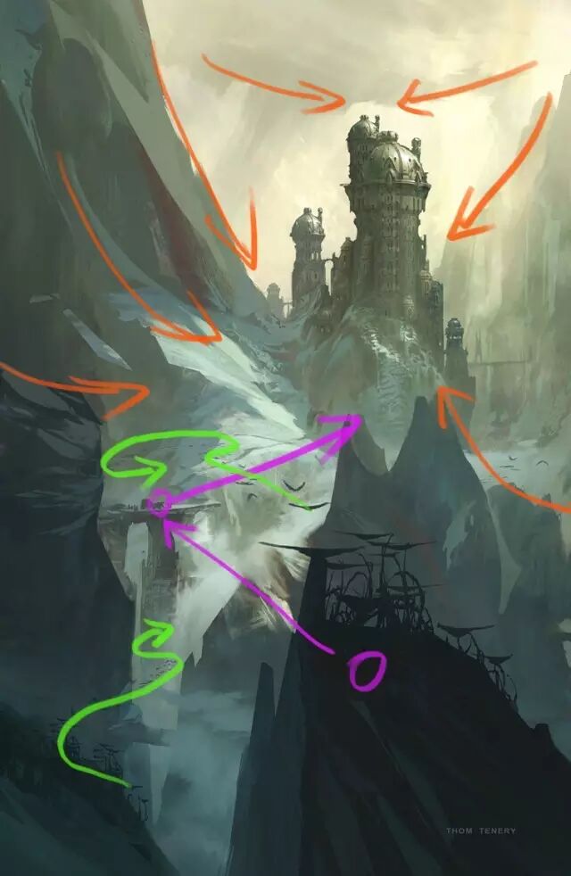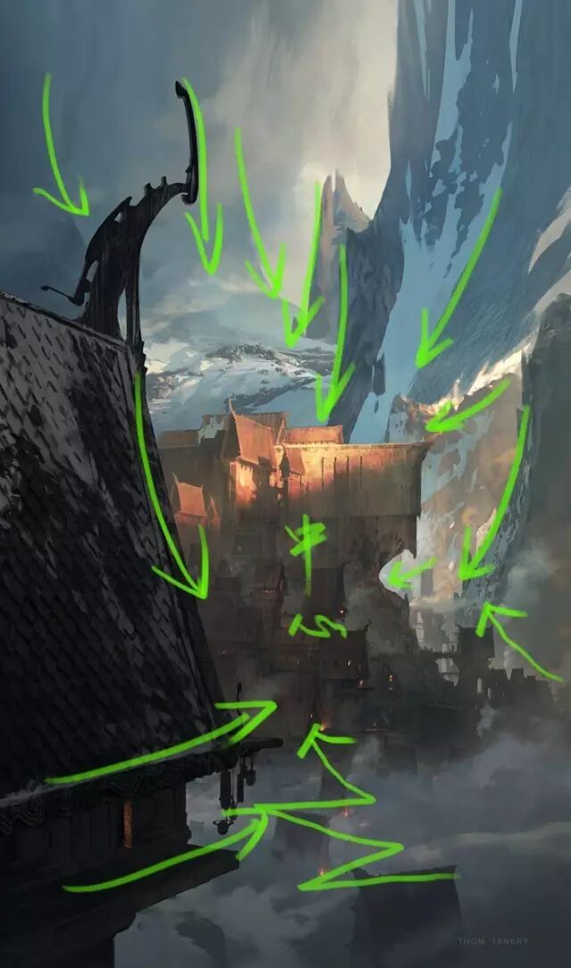 概念设计师 Thom Tenery的作品,这个作者的图视觉引导做的很棒,整体的画面表达清晰明了,画面里暗含了很多巧妙的设计,心机很重,是一个心机Boy(褒义词,绘画里需要心机,需要巧妙,这些都是藏在画面背后的东西)~