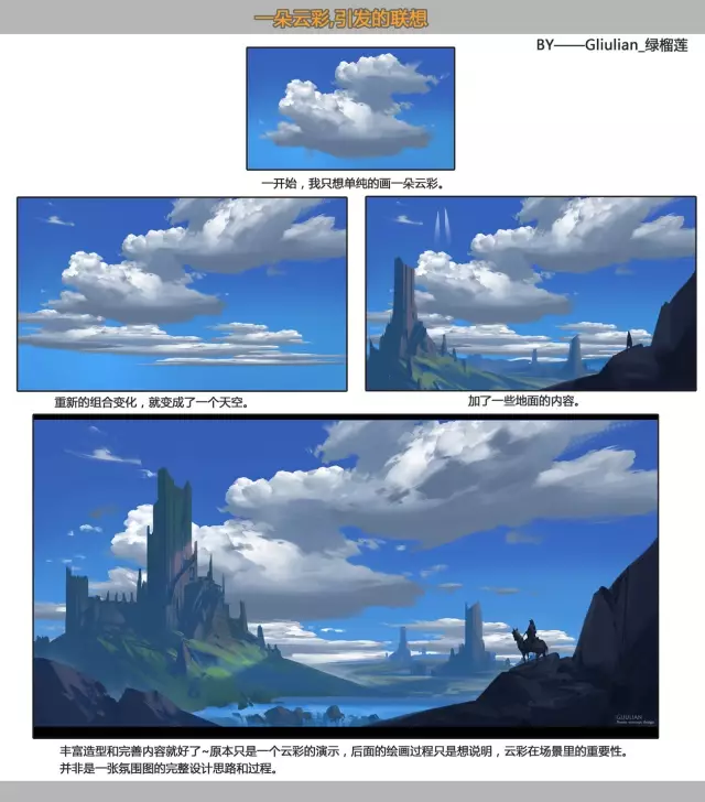 这是一张涂的很快的图,如果仔细观察就会发现,实际云彩只画了一朵,然后重新的组合了一下,简单的加了一点地面,就完成了,虽然没画什么细节,但整体也会有一定的完成度,实际主要的目的还是想去说明,云彩在场景当中的重要性,我们在画场景的过程中,是多多少少都躲不开一些云彩的绘画,所以对于云彩我们是非常有必要去多练习的,下面这个绘画的过程其实不是一个完整创作的绘画思路和过程,只是通过这样快速的方式,让小伙伴可以立刻的体会到云彩的组成和云彩的效果,在实际的创作过程中,云彩我们还是需要整体的去设计,然后再去完善的。