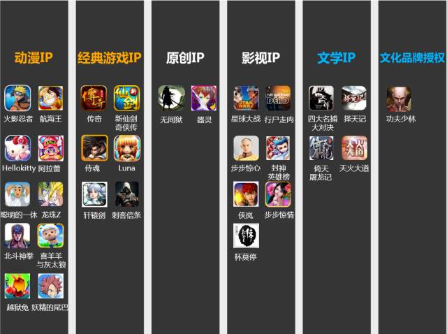 早在2013年,中手游便全力布局IP储备,逐渐将发展策略修改为“自研 发行 IP”。《火影忍者》、《航海王》、《龙珠Z》、《北斗神拳》、《妖精的尾巴》、《HELLO KITTY》、《喜羊羊与灰太狼》、《步步惊心》、《择天记》、《侍魂》、《新仙剑奇侠传》、《轩辕剑》、《阿拉蕾》、《功夫少林》、《星球大战:指挥官》、《刺客信条》、《行尸走肉》……这些大名鼎鼎的IP全被中手游收入囊中,几乎覆盖了顶级动漫、游戏、小说、影视等各种泛娱乐领域。