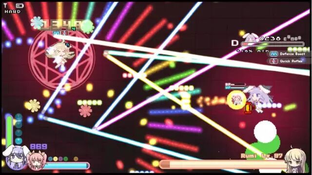 BOSS 战中难度上的设计也让人不敢苟同。弹幕游戏的难度应该体现在弹幕的复杂度上,然而本作的难度区分仅仅是受到伤害增加,BOSS 血条减少这样偷懒的设计。虽说游戏分了很多难度,说是让新手玩家也能享受游戏。但若是正面硬刚都能赢的话,那么手残玩家又能在弹幕游戏里获得多少完整的游戏体验呢?