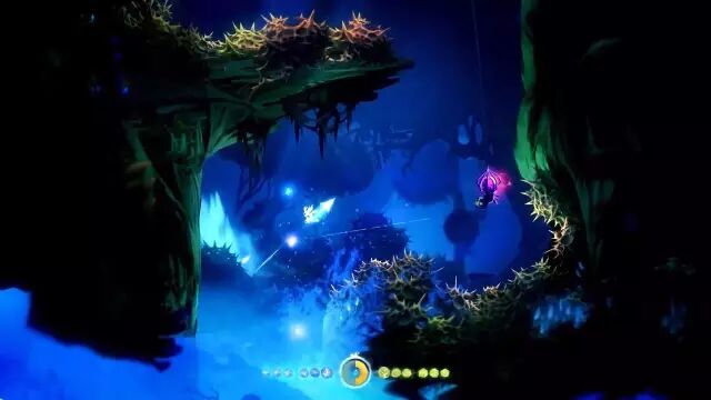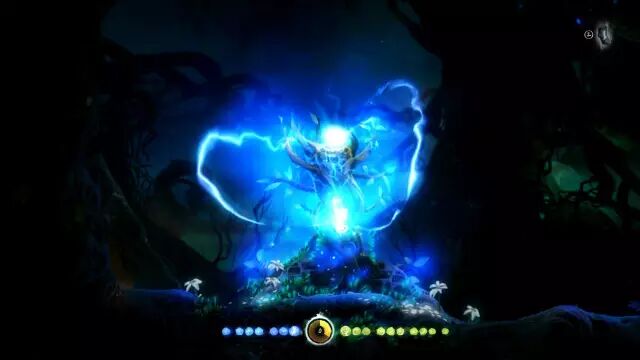 另外,奥日有一个不同于其他 Metroidvania 类游戏的地方在于储存点的设计,游戏并不要求玩家到达一个特定的 Checkpoint 储存进度,而是任何时候都可以呼出储存点(耗费1点能量)。不过这种设计也造成一些小小的问题,即当我在低生命值而且没有能量的情况下会“卡死”,即每一次死亡都会令我复活在一个我不巧放置得失败的储存点上,我没有足够的生命冲出去也没有足够的能量开新的储存点,这时不免会有一些尴尬。不过总体上来说自由存储给了玩家很多便利。