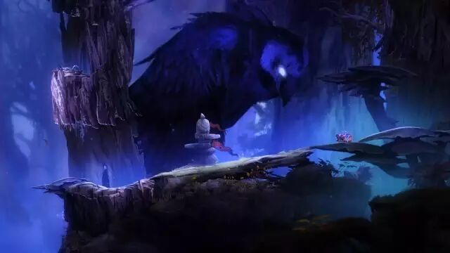 此外,将前背景纳入到关卡设计中来也是《奥日》的关卡设计中显得相当新颖的一部分。前景因为会遮挡所以只好用来交代环境,游戏在为 Mogu 的出现设置伏笔是,几次令他以黑影的形式出现在前景中。而关于背景,有一段游戏中猫头鹰就在后面,如果你在空旷的地方呆时间长了,他就会飞过来把你抓住,因此只能选择树后面或者洞里面等等有遮挡的地方,对于平台类游戏来说是比较少见的创意。总之,奥日在关卡设计上可以说非常好地实现了关卡与叙事的结合(虽然这本来就是 Platformer 类的优势)。