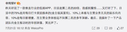 正如纯银在微博中说的,打卡任务积分奖励可以大幅提高日活数据。虽然纯银对此持消极态度,但我认为,有些行业和有些产品注定有低频特性,产品依靠主业务停留在用户手机中的概率较低,倒不如用积分来留住用户。当用户养成使用 App 的习惯之后,更换产品的成本就会增大(因为在产品上累计了积分)。虽然积分和会员体系并不是万能灵药,但在大多数情况下,运作良好的积分体系可以反哺产品主业务本身。