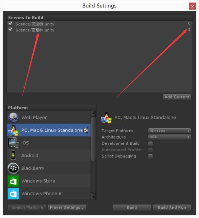 方法参数可以是scence的名字或者是scence所对应的数字ID。但是由于在开发过程中场景可能会发生变动,所以ID会变化,所以一般参数选择scence的名字。注意,加载的场景必须要 add Current上去,不然找不到的。